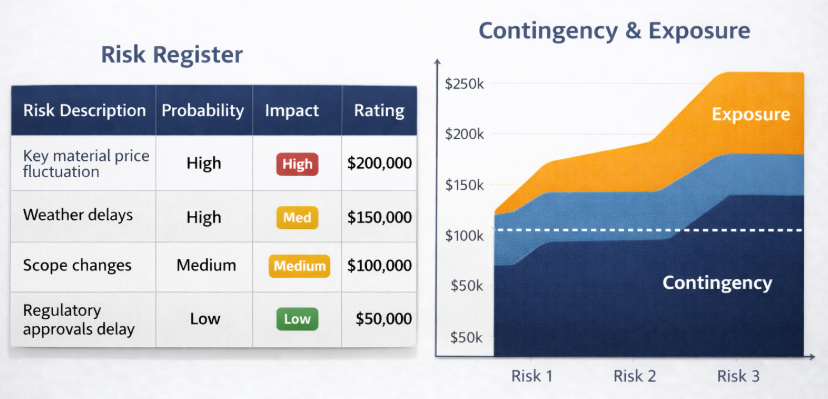 Services include managing risks, risk registers, and applying costs for various risks identified through the project lifecycle